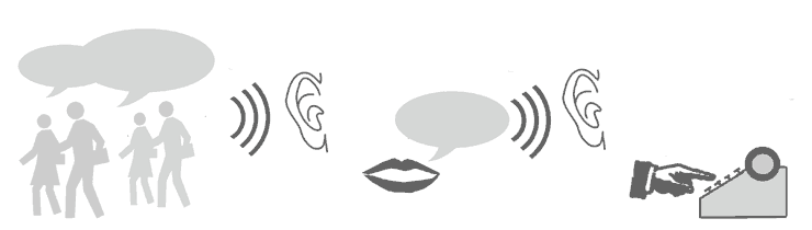 Einen weiteren Ansatzpunkt stellte die Veränderung, die Worte in einer Weitergabe erfahren, dar. Sowohl im Nachsprechen als auch im Hören verschieben sich Bedeutungen geringfügig. Nach unten visualisiertem Schema erfuhr ein zufällig gehörtes Ausgangswort so eine dreimalige Übersetzung bevor es auf Papier gebannt wurde