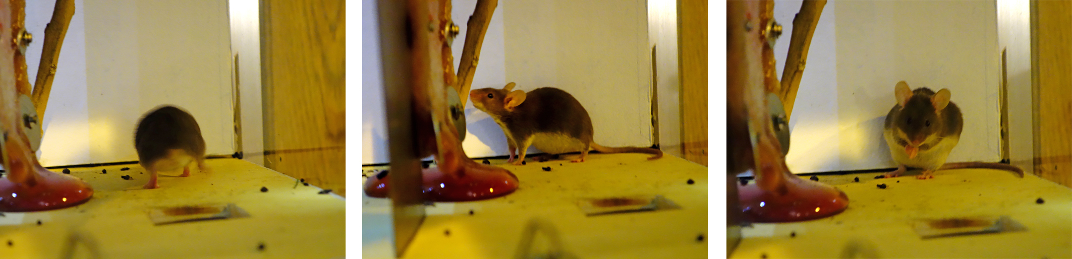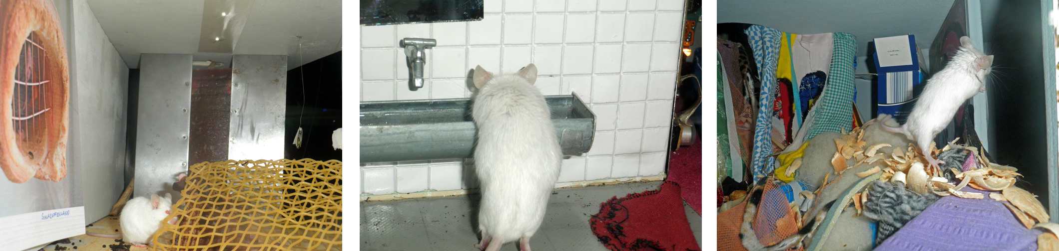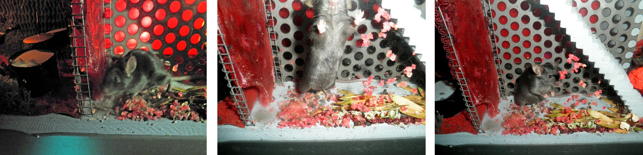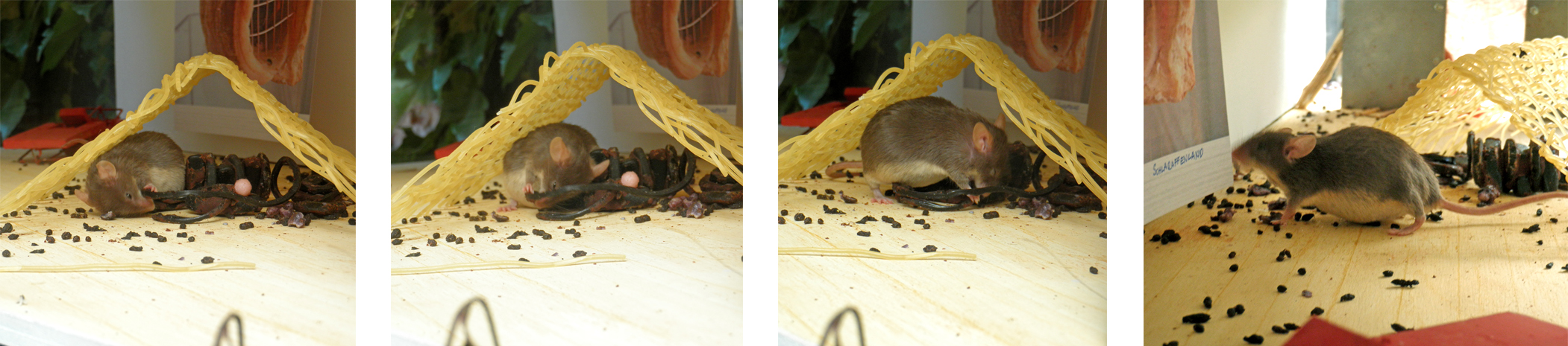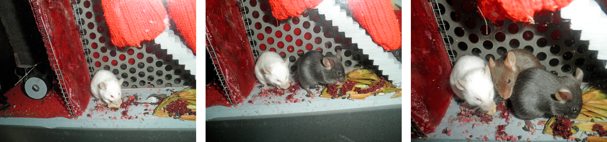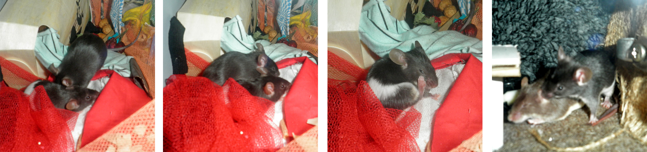 20.10.: die Mäuse leben verschiedene Schlaf- und Wachrythmen in zumeist gleichen Konstellationen die drei Weibchen Rudolfine, Rapunzel und Rabiata sind fast immer gemeinsam unterwegs, Fräulein Semmel, die etwas zurückgeblieben und viel kleiner ist immer allein. Herr Helge stellt einer der Fräuleins nach oder zieht allein ums Haus